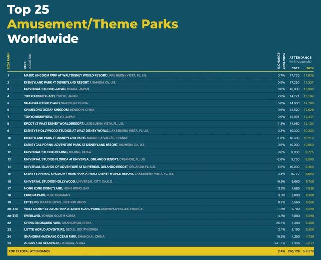 2024年全球游客最多的25大主题公园上海迪士尼和长隆海洋王国进入前十